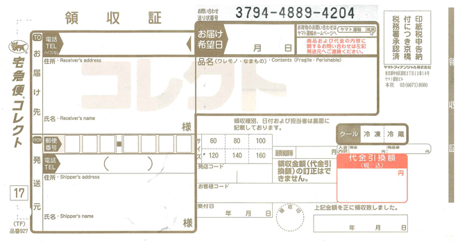 領収書は宅配業者が代行して発行いたします。ご購入金額に応じて代金引換手数料を頂戴しています。 -